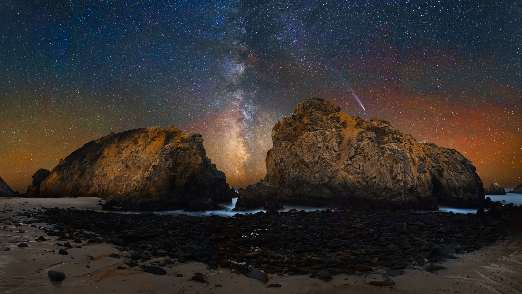 Comet C/2023 A3 captured over the iconic rock formations in Pfeiffer Beach, Big Sur, California, USA
